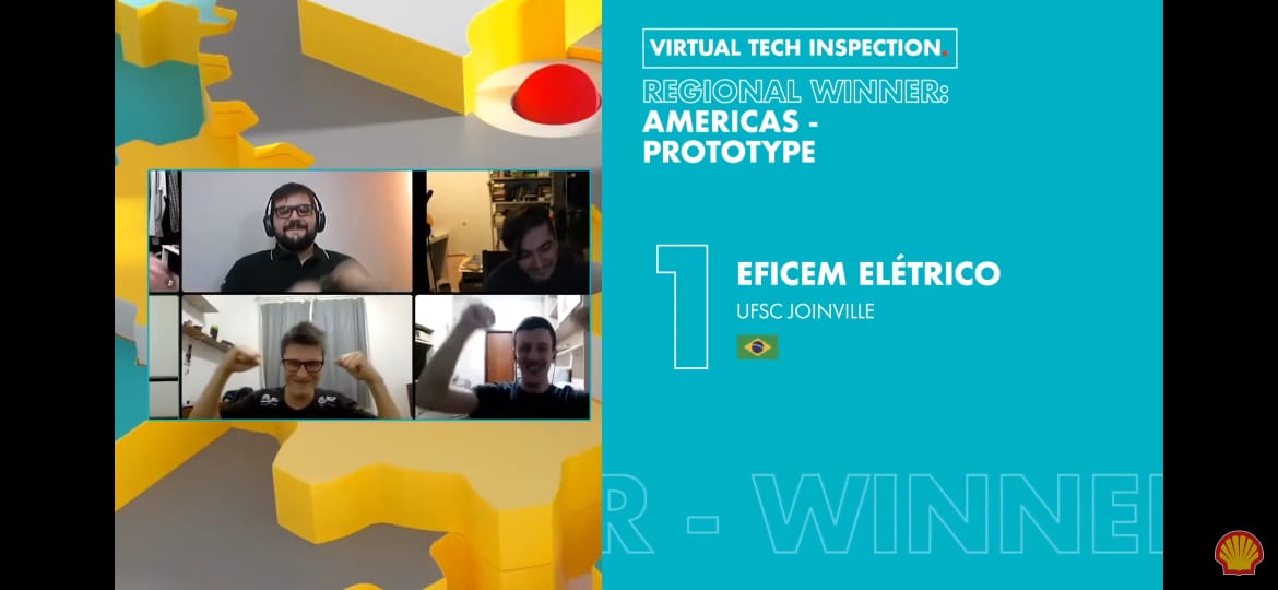 A equipe de Eficiência Energética da UFSC Joinville, Eficem, conquistou o primeiro lugar das Américas, na competição “Virtual Tech Inspection”, um dos desafios propostos na Virtual League, competição criada pela empresa multinacional Shell para as equipes que participavam da Shell Eco-marathon, suspensa em 2020 e 2021 por conta da pandemia de COVID-19.